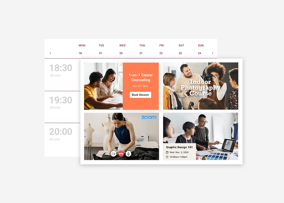 You can choose from 10+ online booking website templates, featuring fitness, beauty, consulting, photography, maintenance, and more. Set up 1-on-1 appointments, group classes, workshops, intro calls and more from your account.