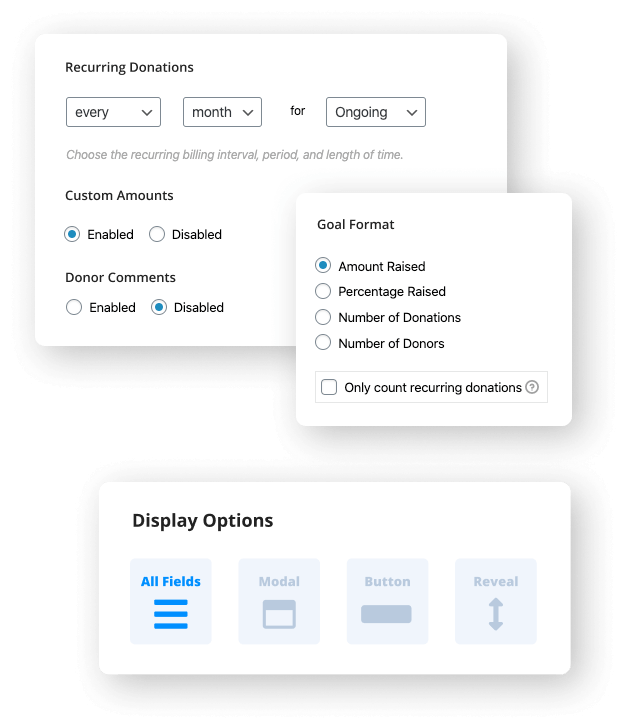 Build donation forms that fit your style and your fundraiser. Choose from a variety of display options.